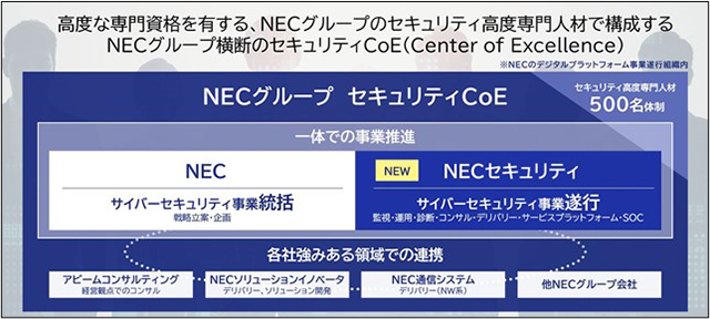NECは、NECグループのサイバーセキュリティ専門企業である株式会社インフォセックを母体として、グループ全体のサイバーセキュリティ事業を推進するNECセキュリティ株式会社(以下、NECセキュリティ)を2023年4月1日に発足します。