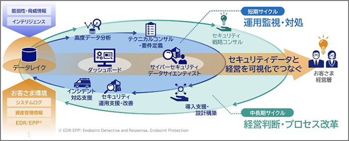 NECセキュリティは、グループ横断のセキュリティCoE(Center of Excellence)の中核企業として、企業が保有する実データを起点にセキュリティ戦略策定支援から導入・運用・監視・対処までをEnd to Endで提供するデーダドリブンサイバーセキュリティサービスを中心にサイバーセキュリティ事業(注1)を遂行します。
