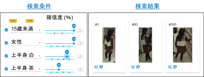 今回NECが開発した技術は、まずカメラに映っている人物の視覚的な特徴から、性別、上下それぞれの服や帽子、靴の色・形状、鞄などの持ち物の情報といった100以上の属性情報をAIによる推定の確信度とともに付与することができます。そして、特定人物の検索の際には、それぞれの検索条件について、記憶とAIによる推定、双方の曖昧さを考慮し総合的に合致するかを判定して検索結果を出力する業界初(注2)の技術である「あいまい検索技術」の活用により、対象人物を効率的に発見します。例えば、服装の色について記憶が誤っている場合や、光の加減によりAIによる推定が事実と異なる場合など、検索条件の一部に該当しないものがあっても候補から排除することなく対象人物を見つけることができます。さらに、本技術は顔画像を使用しなくても外観属性の推定が可能です。これにより、カメラ映像から人物を高速・高精度に検索することができるだけでなく、プライバシーに配慮した運用も可能なため、商業施設における映像分析技術の導入に貢献します。