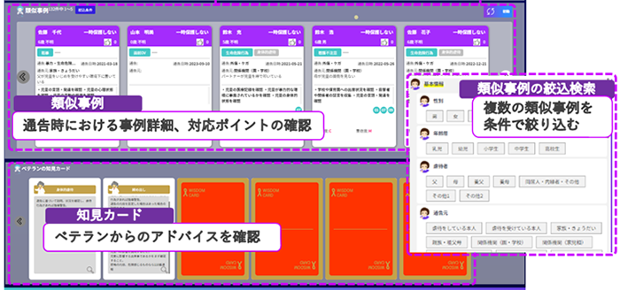 児童相談所内のリスクアセスメントデータと、それに紐づくベテラン職員の知見・ノウハウをAIに学習させることで、児童虐待対応における通告時、調査時、処遇時の各フェーズに応じて通告内容の過去類似事例や、ベテラン職員からのアドバイスなどの有益な情報を提示します(注2)。本システムは伴走ツールとして補助的に使用するものであり、経験の浅い職員でもベテラン職員と同じような着想で行動することを支援し、組織全体の対応の質向上を実現します。