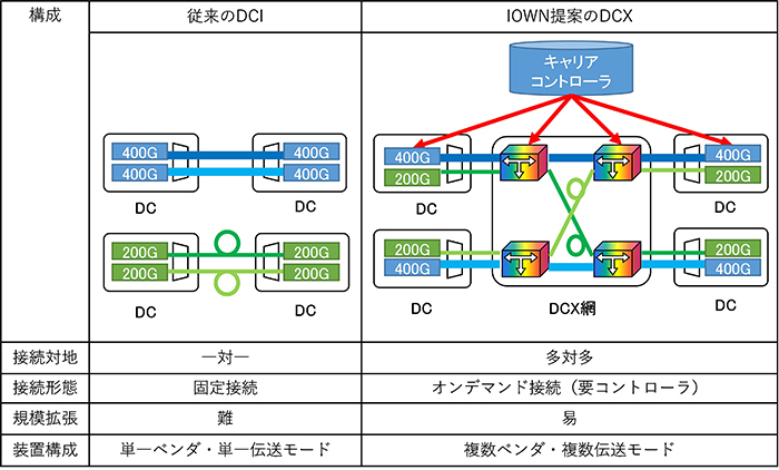 一方、コンピューティングリソースを収容するデータセンタの建設・運用の分野においても、これまで都市部に集中していたデータセンタに対し、電力やインフラスペースが豊富で災害リスクを分散できる郊外への移転が進んでおり、遠隔地を高速・低遅延に接続する光波長パスの必要性が高まっています。しかしながら、従来のデータセンタ間通信 (DCI) は一対一のシンプルなトポロジーで、かつ単一ベンダ・単一伝送モードで装置を構成するのが一般的であるため、規模拡張性に乏しく、データセンタの分散化を大規模に進めることが困難でした。