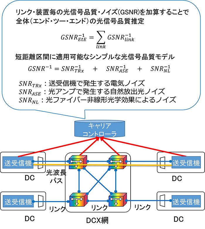 オンデマンドにエンド・ツー・エンドの光波長パス接続を提供するには、ファイバー伝搬や光アンプ・光伝送装置・光スイッチのノイズによる光信号品質の劣化を短時間で算出する必要があります。近年、トリノ工科大学が提案したガウシアンノイズモデルにより、長距離伝送時の光ファイバー非線形光学効果に起因する光信号品質劣化を短時間で計算できるようになり、多くのオペレータによってその精度が証明されてきました。一方でDCXが対象とする100~200km程度の短距離区間においては長距離伝送とは光信号品質劣化の支配要因が異なり、光伝送装置などこれまでに十分に考慮されていなかったノイズの影響を加味したモデル化が必要でした。