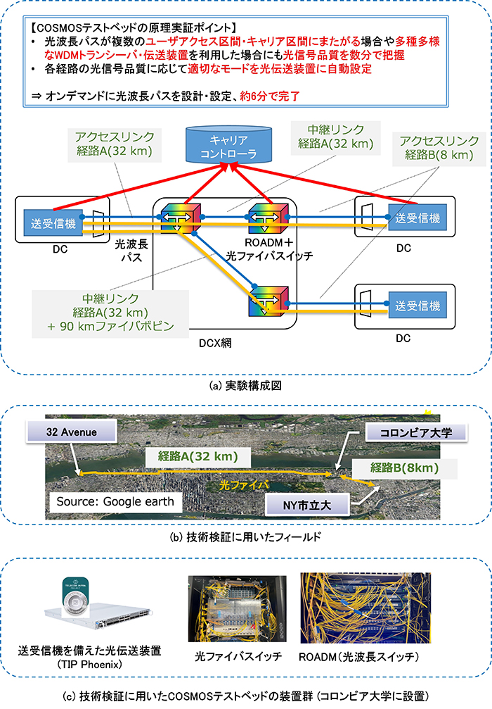 またNTTとNECは、コロンビア大学・デューク大学・ダブリン大学の協力のもと、NSF出資による米国の学術網「COSMOSテストベッド」にて本手法のフィールド検証実験を行いました (図4)。COSMOSテストベッドはニューヨーク市に構築された学術網であり、マンハッタンに敷設されたフィールドファイバー(BoldynとCrown Castleにより提供)や光アンプ・光ファイバスイッチ・光波長スイッチ(ROADM)を備えています。このCOSMOSテストベッド上にDCXを模擬した、ユーザデータセンタとキャリア網、それらを繋ぐアクセスファイバから構成される実験系を構築しました。NTTとNECが実装した光信号品質の計算アルゴリズム及び光波長パス設定手法により、短距離と長距離のルートについて光信号品質の計算結果をもとに適切な光伝送装置の伝送モードを設定し、約6分で光波長パスの設計・設定が自動的に完了することと、本方式をDCXサービスに適用した場合の誤差が十分小さいことを確認しました。