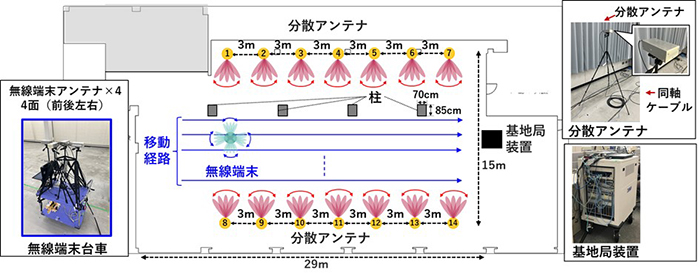 本技術の実証実験を、29m×15mの広さで、柱が4本存在する実験室で実施しました(図2-1)。使用した実験機は、周波数帯については、国内での5Gミリ波の28GHz帯よりもさらに高い周波数帯である40GHz帯を使用しました※10。その他の物理仕様は5G NR(New Radio)に準拠しており、信号帯域100MHz、サブキャリア間隔60kHzのOFDM※11方式です。また、同軸ケーブル(長さ20m)により、基地局装置は複数の分散アンテナを接続しています。分散アンテナは#1~#14の位置に最大14台設置し、無線端末は、前後左右の最大4面方向に4アンテナを装備し、図中の経路上を台車で移動させました。