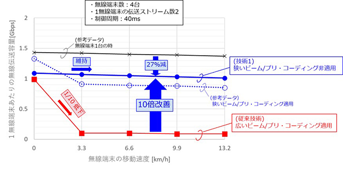 実験結果により、広いビームかつプリ・コーディングを適用する場合、プリ・コーディングの干渉抑制効果が局所的であるため、静止時と比べて、移動速度3.3km/h以上で無線伝送容量が1/10に劣化します。一方、狭いビームを適用する本技術の場合、狭いビームが広い方向に干渉抑制を維持するため、静止時の無線伝送容量を移動速度3.3km/h以上の場合でも維持します。また、無線端末が1台のみの時と比べて、無線伝送容量の劣化を27%に抑えることができています。さらに、狭いビームにプリ・コーディングを適用した場合、移動速度3.3km/h以上では、プリ・コーディング非適用の本技術より無線伝送容量が劣化しますが、静止時は、本技術よりも無線伝送容量が向上し、無線端末が1台のみの時とほぼ同じ無線伝送容量を実現しています。これから、仮に、無線端末の移動にもとづいて、プリ・コーディングの適用/非適用を制御できれば、狭いビームの適用により、無線端末の静止・移動に依らずに、安定した無線伝送容量を実現できる可能性も確認できました。