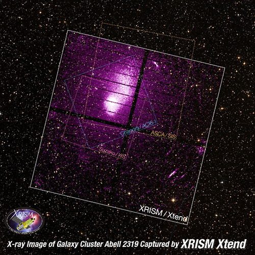 XRISMは、銀河を吹き渡る風である「高温プラズマ」の速度や化学組成を調べることにより、星や銀河、銀河の集団がつくる大規模構造の成り立ちをこれまでにない詳しさで明らかにするため、2023年9月7日に種子島宇宙センターから打上げられたX線分光撮像衛星です。この衛星は微弱なX線を検出するX線マイクロカロリメータ(注2)を搭載した軟X線分光装置(Resolve:リゾルブ)とX線CCDカメラを搭載した軟X線撮像装置(Xtend:エクステンド)による超高分解能X線分光撮像の世界を開拓することを目指しています。(注3)