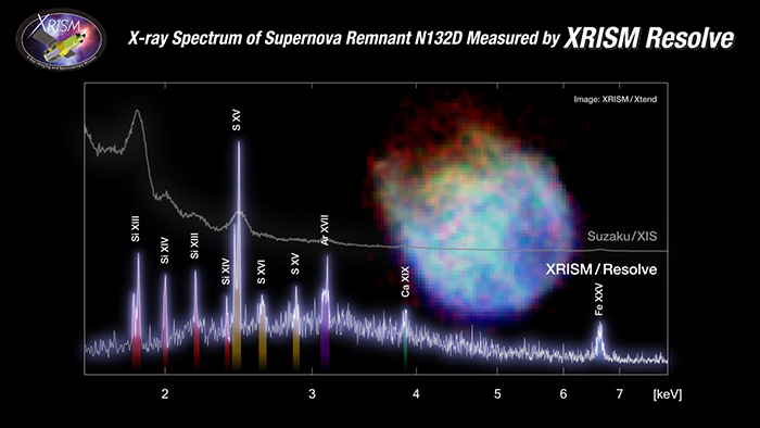 太陽系からの距離は約16万3000光年。白色で示したスペクトルはResolveで取得されたもの。灰色で示したスペクトルはX線天文衛星「すざく」で取得されたもの(出典:Bamba et al., 2018, ApJ, 854, 71)。グラフの背景の画像はXtendにより撮影されたN132D。