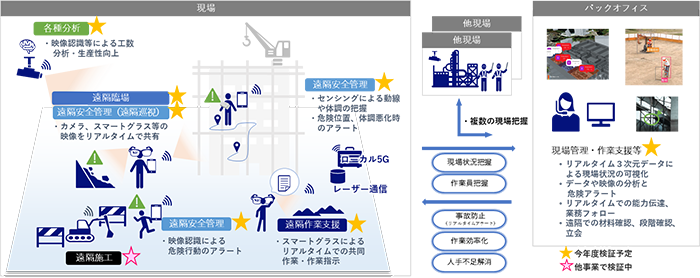 建設分野においては、建設労働者の減少・高齢化や、働き方改革関連法の施行への対応、安全・安心な労働環境の構築などの課題に加え、建設現場において通信環境をどのように整備するかといった課題が存在します。そこで、建設現場にローカル5G環境を構築し、3次元可視化プラットフォームを用いたデジタルツイン上で作業者の遠隔安全管理、作業者と管理者/発注者の業務効率化を目指す遠隔支援や遠隔臨場の実証を行います。