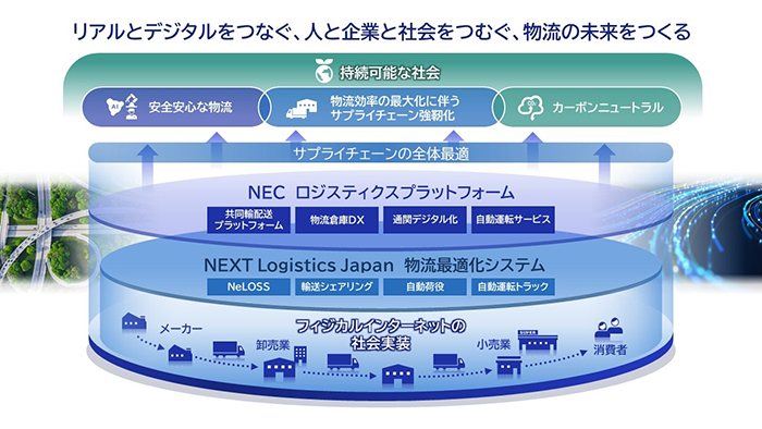 今回、NECとNLJの強みを組み合わせることで、この取り組みを加速し、日本全国がつながるフィジカルインターネットの社会実装に向け、協業の検討を深めていきたいと考えています。