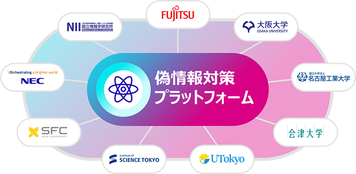 内閣府や経済産業省、その他の関係府省が連携し、経済安全保障の強化、推進に向けて創設した「経済安全保障重要技術育成プログラム(通称“K Program")」(注1)のもと、国立研究開発法人新エネルギー・産業技術総合開発機構(以下、NEDO)が公募した、「偽情報分析に係る技術の開発」(注2)(以下、本事業)に、2024年7月に採択された富士通株式会社(以下、富士通)は、プライム事業者として偽情報検知と評価における国内屈指のアカデミアや企業を再委託先として選定し、大学共同利用機関法人 情報・システム研究機構 国立情報学研究所(以下、NII)、日本電気株式会社(以下、NEC)、慶應義塾大学SFC研究所、国立大学法人東京科学大学(以下、東京科学大学。採択時、国立大学法人東京工業大学)、国立大学法人東京大学(以下、東京大学)、公立大学法人会津大学(以下、会津大学)、国立大学法人名古屋工業大学(以下、名古屋工業大学)、国立大学法人大阪大学(以下、大阪大学)の9者(注3)によるオールジャパン体制で、偽情報の検知から根拠収集、分析、評価までを統合的に行う点で世界初の偽情報対策プラットフォームを2025年度末までに構築することを目指し、2024年10月より共同研究開発を開始します。