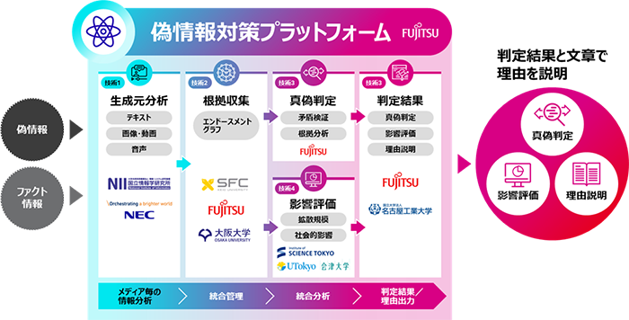 9者は、上記アプローチに基づき、偽情報の検知(技術1)、根拠収集・統合管理(技術2)、総合的な分析(技術3)、社会的な影響度評価(技術4)に関する各種技術の研究開発を開始するとともに、富士通がこれら技術を統合し、偽情報の検知から根拠収集、分析、評価までを統合的に行う世界初の偽情報対策プラットフォームの構築を進めていきます。