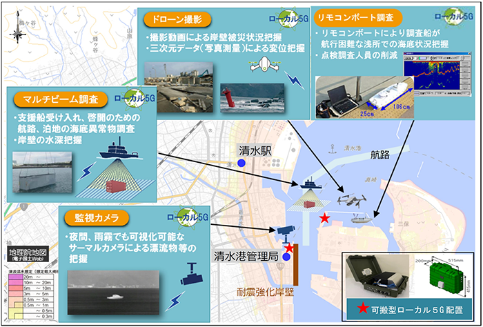 本実証事業では、静岡県清水港においてローカル5G環境を構築し、災害時・平常時の港湾施設点検の高度化の実現に向けた下記の実証試験を行います。