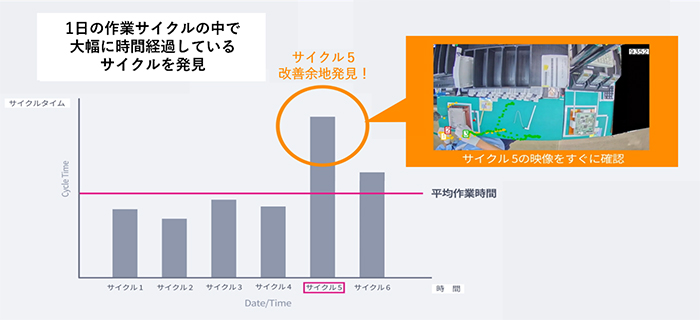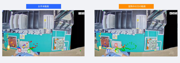 映像に映る作業者の手の動きのパターンに基づき、作業の開始や終了を特定することでサイクルタイムの計測が自動で可能になります。これにより、サイクル毎の作業時間のバラつきが可視化され、時間のかかり過ぎたサイクルの録画をピンポイントで確認し、生産性改善に向けた作業の問題を発見することができます。また、手の軌跡も記録されるため、予め撮影しておいた熟練作業者の手の軌跡と比較することができ、スキルアップを支援することができます。