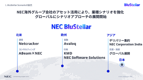 豊富な実績を持つNEC海外グループ会社のプロダクト&サービスをBluStellar Scenarioに組み込みます。具体的には、金融業向けには欧州のAvaloq社、ガバメント領域では同じく欧州のKMD社とNEC Software Solutions社、通信業では北米に展開するNetcracker社、コンサルティング業ではアビームコンサルティング社との連携を通じて業種シナリオを拡充し、グローバルに提供します。