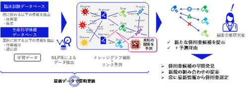 がん治療の選択肢の一つに、2種類以上の薬剤を組み合わせて使用する薬剤併用療法があります。薬剤併用療法は、単剤投与時と比べて高い治療効果が期待される一方、これまで薬剤の組み合わせを予測するためには、膨大な論文や臨床試験データなどをもとに、薬剤の組み合わせ実績や関連する疾患、作用機序(注2)、適応症(注3)などの情報を手作業で調査・分析する必要があり、多大な時間を要することが課題でした。