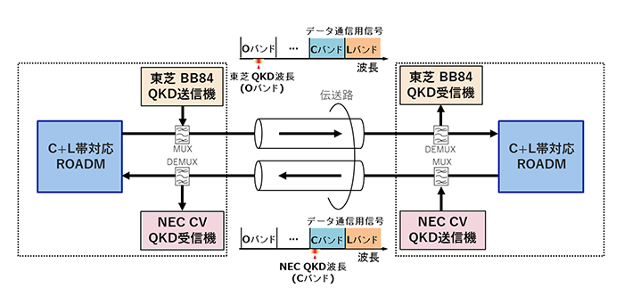 QKDの方式として、東芝は量子力学により担保された情報理論的に安全性が証明されているBB84(*9)方式を、NECはデータ通信帯域での多重化や小型・低コスト化が容易であるCV(*10)方式を採用しました。2つの異なるQKD信号と、それに合わせて送受信される制御用光信号を、光伝搬方向が異なる2心の光ファイバそれぞれに収容しました。さらに、通信キャリアの基幹系光ネットワークで実際に使用される環境を模擬するため、同一のファイバにおいて、CバンドおよびLバンドの波長帯全域に光出力+17dBmで、伝送速度47.2Tbpsに相当するダミーのデータ通信用光信号とQKD信号を多重化し、それぞれの信号の波長が干渉し合わないように波長を割り当てる制御をして、25kmの伝送を行いました。上記の条件下で、8時間連続で2つの異なるQKD方式による同時鍵生成に成功しました。また、CバンドおよびLバンドの帯域内に配置した1波長あたりの伝送速度400Gbpsおよび800Gbpsの高速データ通信用の実信号をエラーフリーで伝送しながら、単一光子レベルのQKD信号と共存できることを確認しました。