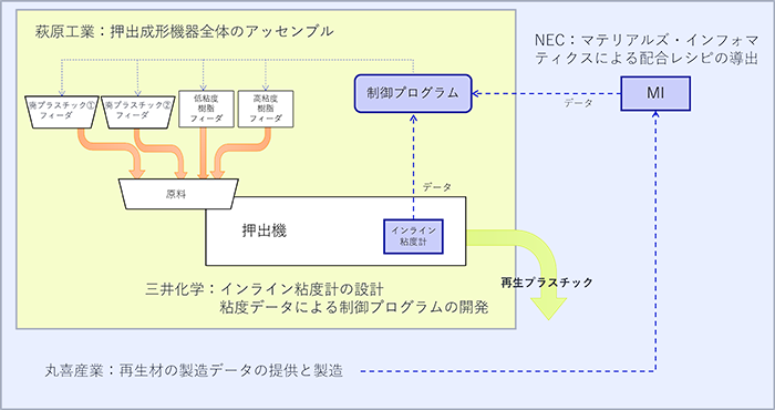 本協業では、三井化学と萩原工業が開発し、本年10月より萩原工業から製造・販売を開始した、再生プラスチック製造中の粘度を計測し添加剤の投入量を調整することで均一化する技術(注7)を活用した押出機を用いて、丸喜産業の工場で得られた粘度のデータをNECのMI技術で分析します。これにより、再生プラスチックの製造に必要なすべての材料を、粘度を計測しながらリアルタイムで調整することが可能となり、品質の安定化を実現します。また、再生プラスチックを製造・利用する企業の品質安定化プロセスとして必要なタンブリング工程が不要となり、製造全体にかかる時間について従来比25%の削減を目指します。