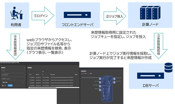 - HPCシミュレーションにおける入出力ファイルやプログラム実行情報等の来歴情報を自動的に採取、参照することが可能なHPC来歴管理システム「NEC Data Provenance System for HPC」(注2)