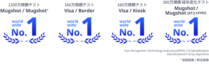 本ベンチマークテストにおいては、1,200万人分の静止画を用いた「1:N認証」(注4)で認証エラー率0.06%と、参加した世界の企業・団体が提出したアルゴリズムの中で第1位の性能評価を獲得しました。また、160万人分の静止画を用いた2つのテストと、撮影後12年以上経過した画像を用いて評価を行う経年変化のテストでも第1位となるなど、NISTのWebサイトに掲載されたFRTE 1:N Identification (T>0) by Algorithmの主要8項目のうち4項目で第1位を獲得する高い評価を獲得しました(注5)。