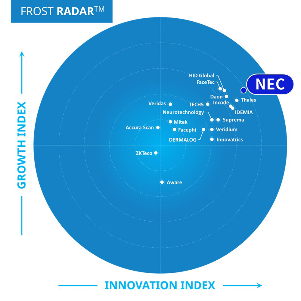 今回の市場調査でFrost & Sullivanは、NECの幅広い生体認証事業ポートフォリオに対する継続的なイノベーションの成果として、NECがFrost Radar™におけるイノベーション指数でリーダーシップのスコアを獲得したと評価しました。