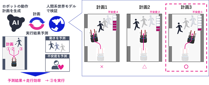 NECは、人の動きと心理状態を予測する独自の「世界モデル(注1、以下人間系世界モデル)」を活用し、人の不安の程度を定量的に推定した上で、不安を高めないように先回りしてロボットを制御するフィジカルAIを、世界で初めて開発しました(注2)。
