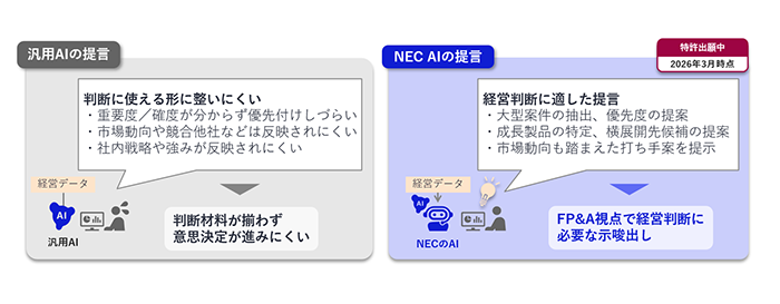 NECは、部門責任者やマネジメント層を中心に、データに基づいた最適な意思決定を支援する「NEC経営戦略支援コックピット」を、2026年4月から提供開始します。本ソリューションは、NECがFP&A(注1)で培ってきたノウハウを活かした分析・報告の観点を取リ入れ、意思決定に必要な気づきと実行すべき打ち手案を提示する経営レコメンドAIエージェント(注2)を中心に構成されています。社内の経営データに加え、市場や競合などの公開情報も自動的に収集・統合して分析を行い、外部環境を俯瞰的に捉えつつ、KPIや業績状況を集約し、定期的にインサイトと提言を提示します。これにより、部門責任者やマネジメント層はFP&Aや経営企画部門からの定期報告を待つことなく必要な情報へ即座にアクセスし、迅速に状況を把握できるようになります。その結果、意思決定プロセスの迅速化と高度化を実現します。