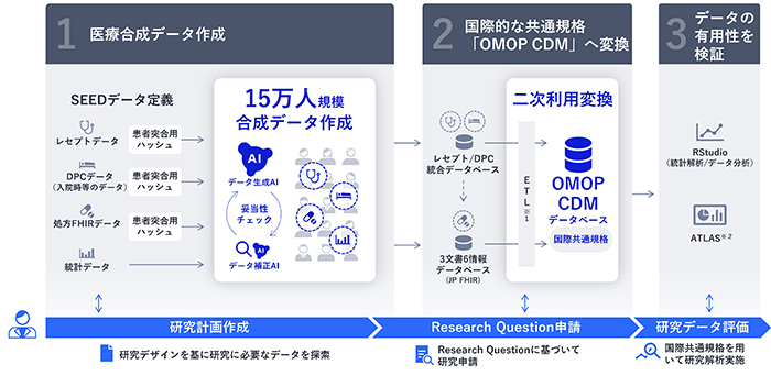 NECは、医療等データの二次利用の推進に向け、生成AIと医療情報の知見を活用して15万人規模の「医療合成データ」(注1)を作成しました。「医療合成データ」は日本人の統計的特徴を反映した架空の患者データの集合です。本データを国際的な医療データ分析向けの共通規格「OMOP」(注2)に沿う形式に変換し、協力団体やパートナー企業とともに評価することで、将来の医療等データの二次利用に向けたデータ活用のプロセスを実証するとともに、「医療合成データ」の研究過程における有用性を確認することができました。