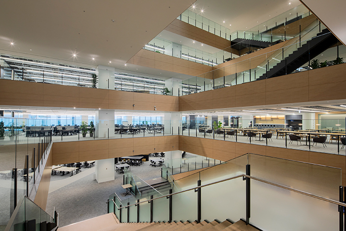 高層階から中層階にかけて吹き抜け構造と内階段を設置することで、人々の流れを生み、思いがけない交流を誘発するなど、イノベーションを創出しやすい空間づくりを目指して設計しました。