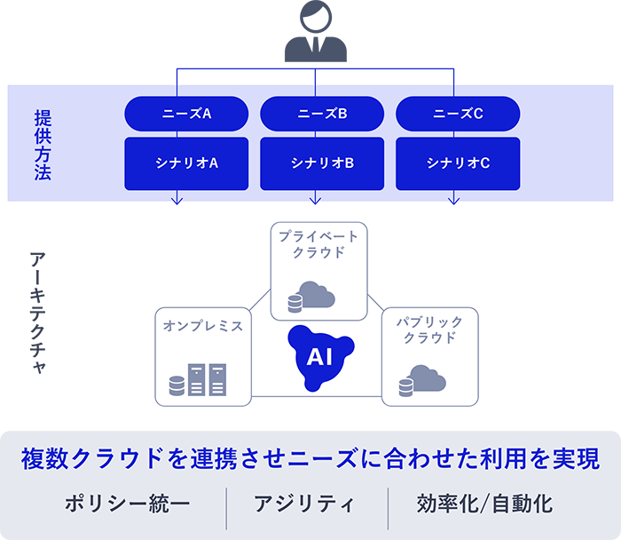 こうした背景のもと、NECは複雑化するハイブリッドクラウド環境においても、データやシステムを横断的に活用し、AIを最大限に生かせるIT基盤を実現することが重要であると考えています。その実現に向けて、構成や運用をあらかじめ設計・標準化する「ハイブリッドクラウド・バイ・デザイン」の考え方を軸に、AI活用を前提としたクラウド基盤の高度化に取り組んでいます。