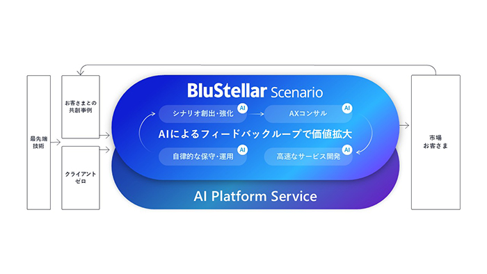 こうした環境の変化を踏まえ、NECは社会とお客さまのAXを支援するため、BluStellarを強化します。お客さまへ提供するシナリオの創出・強化からAXコンサル、高速なサービス開発、自律的な保守・運用といった一連のサイクルにAIを組み込むことで、お客さまの新たな価値創出と価値実現のスピードを向上し、お客さまの経営の深化と競争力の進化を支援します。さらに、NECグループ全体へAXを拡大することで、全国規模でのAXを加速していきます。