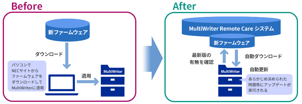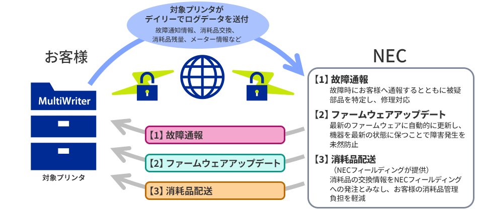 ただし、ハードウェア保守契約(NECが契約者となっている保守契約、またはPrinterSupportPackが該当)の締結が必要です。②ファームウェアアップデートサービス(自動更新)