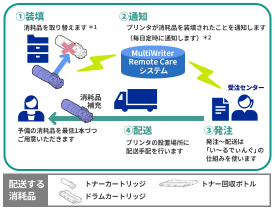 MultiWriterの消耗品を交換したこと(トナー回収ボトルは満杯となったこと)をプリンタが検知した事でお客様との合意に基づき、該当消耗品をNECフィールディングに発注いただいたとみなします。通信販売サイト「い~るでぃんぐ」では該当消耗品のご注文を受け付け、申し込み時に指定されたプリンタ設置場所へ配送します。