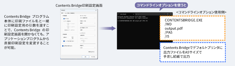 「ContentsBridge」は、PDFファイルをAdobe® Acrobat® やAdobe® Reader、またはXPS*ファイルを専用のアプリケーションで開かずに、プリンタに直接送信して印刷するツールです。いちいちファイルの中身を画面表示することなく、高速に出力可能。プリンタにファイルを送信する方法は、ContentsBridgeのアイコンにドラッグ&ドロップする方法と、lprなどのコマンドで送り込む方法があり、ダイレクト印刷を活用したシステム連携も可能です。