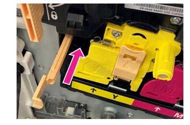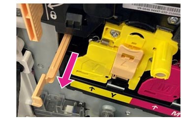 トナー回収ボトルの上にあるツメを下に押しながら、ゆっくりと倒すように引き抜きます。