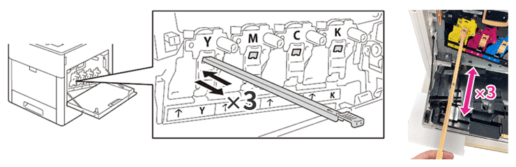 清掃棒の矢印(↑)部を上に向け、奥に突き当たるまで差し込み、ゆっくりと引き抜きます。1つのドラムカートリッジに対し、これを3回繰り返します。