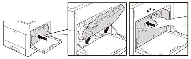 トナー回収ボトルの下にある穴を本体のツメに合わせ、上部を押して「カチッ」と音がするまではめ込みます。