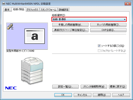 [給紙選択]が[自動]になっていることを確認し、[OK]をクリックします。