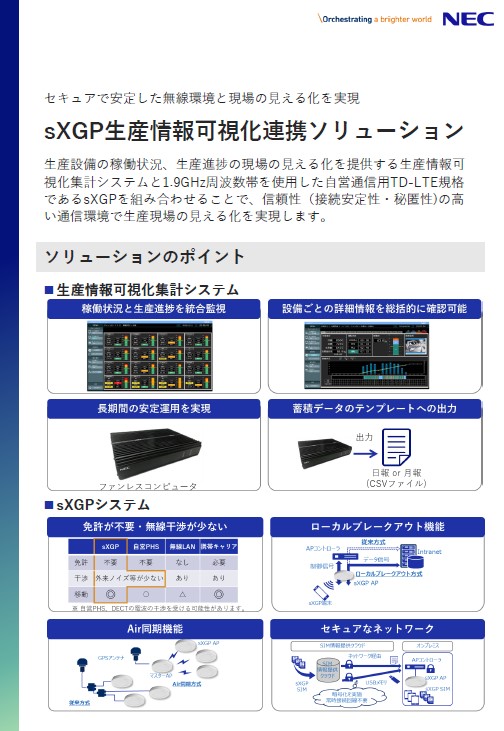 生産設備の稼働状況、生産進捗の現場の見える化を提供する生産情報可視化集計システムと1.9GHz周波数帯を使用した自営通信用TD-LTE規格であるsXGPを組み合わせることで、信頼性(接続安定性・秘匿性)の高い通信環境で生産現場の見える化を実現します。