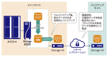重要なデータの遠隔地保管だけでなく、バックアップサイトにディザスタリカバリ用のACOSシステムを配置し、メインサイトからデータ転送しておくことで、万一の大規模災害時や局地災害時にすばやく業務を再開できます。サイト間の距離や必要とされる要件に合わせて、データ転送モード(同期、セミ同期順序保証、非同期)を選択することができます。また、バックアップサイトのACOSシステムはリモート制御可能なため、メインサイトで一元的に運用することができます。