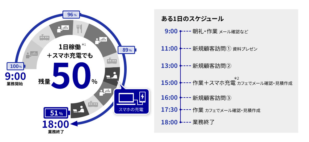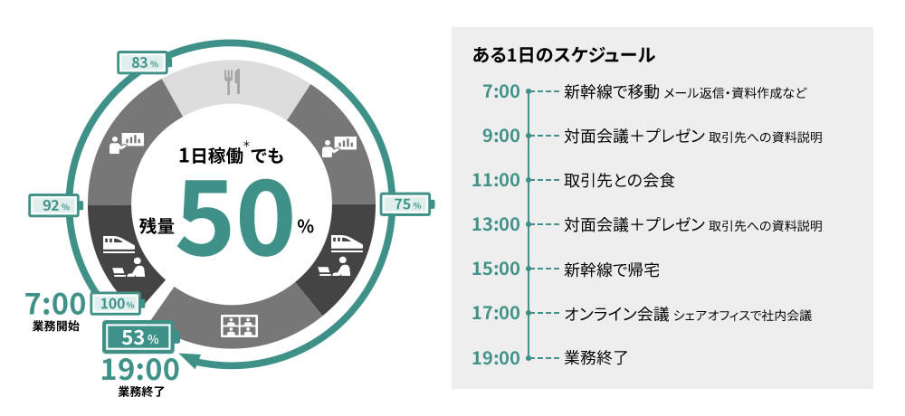 - 朝7:00から19:00の業務終了まで仕事をしても、バッテリーは50%残ります。