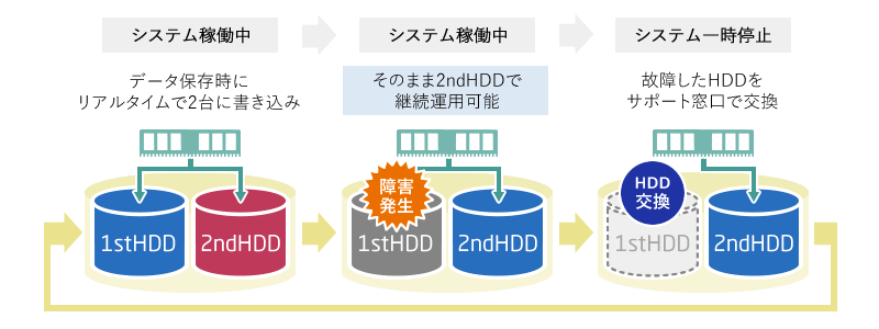 HDDを2台搭載してリアルタイムにシステム/データのバックアップが行える「ミラーリング(RAID 1)」をセレクションメニューより選択可能。万一1台のHDDが故障しても、もう一方のディスクでデータの読み書きを継続できるため、HDD故障によるパソコンのダウンタイムを抑えることができます。