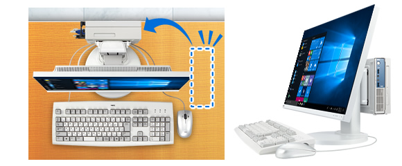 フリーセレクションメニューより「24型3辺狭額縁 フルHD液晶」または「21.5型3辺狭額縁 フルHD液晶」と、「ディスプレイマウント・ブラケット」または「光学ドライブ」を選択すると、タイプMZ本体もしくは、MZ+光学ドライブ*をディスプレイ背面に取り付けることが可能。書類を広げられる机上スペース確保に貢献します。