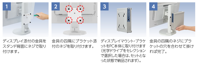 ディスプレイ背面への取り付けは、ネジ止めを中心とした容易な作業だけ。しかも、タイプMCは軽量なので手軽に行えます。
