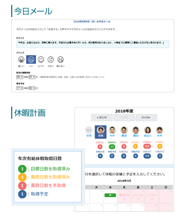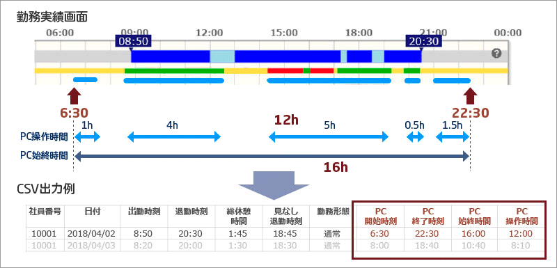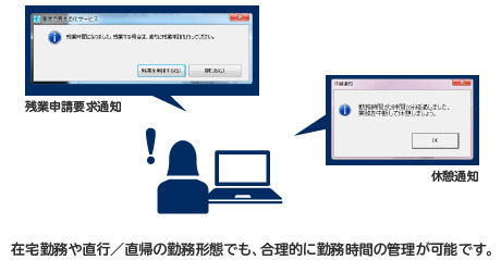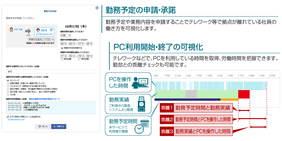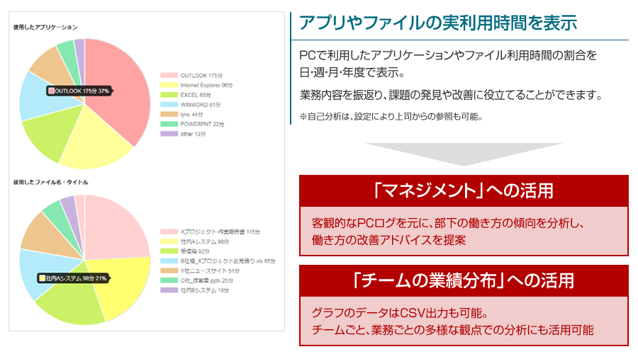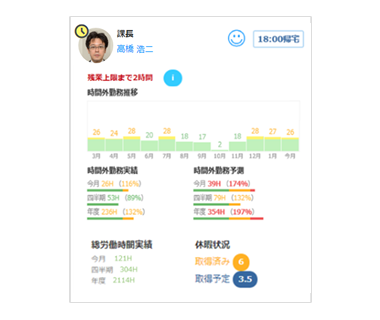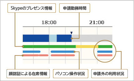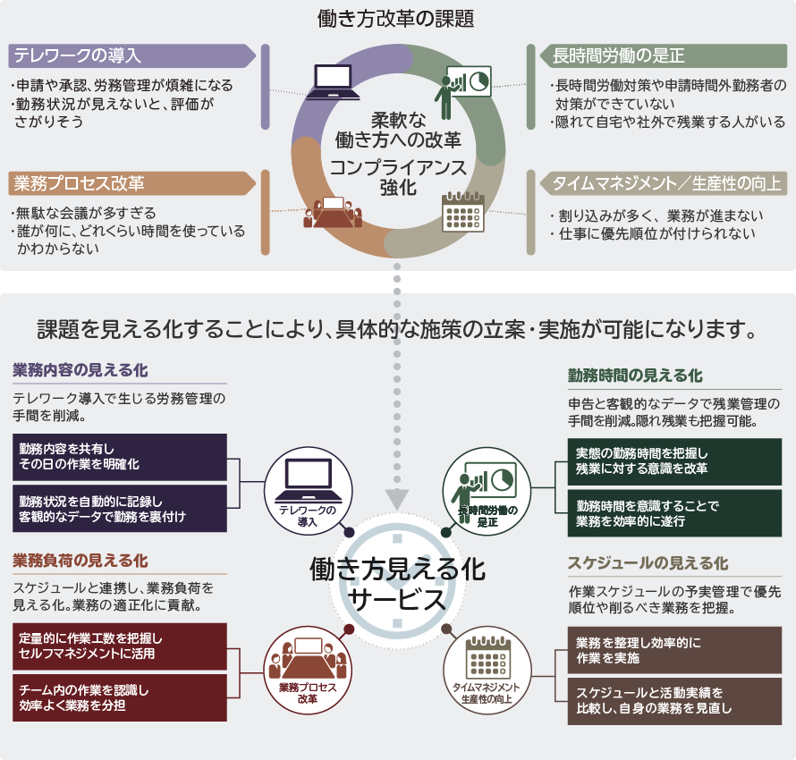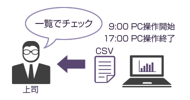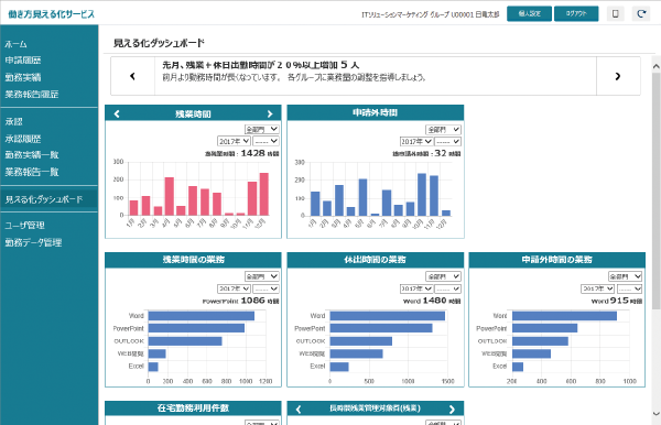PCの利用情報や勤怠データ、グループメンバーの情報などを収集、可視化し、新しい働き方への意識改革を促すとともに労務リスクの低減を支援します。
