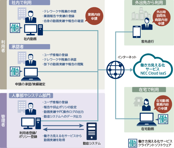 「新型コロナウイルス」対策としてのテレワークや時差出勤など、働き方をフレキシブルに進めたい場合におすすめのクラウドサービスが「NEC 働き方見える化サービス Plus」です。