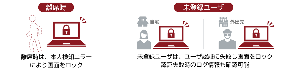 ログオンした後も、一定間隔でPC利用者の顔を認証する「常時認証機能」を搭載。利用者が離席した際や、未登録ユーザがPC前にいて認証NGとなった場合には画面をロックします。これによりロック忘れ等による離席中の他人の不正利用を防止します。