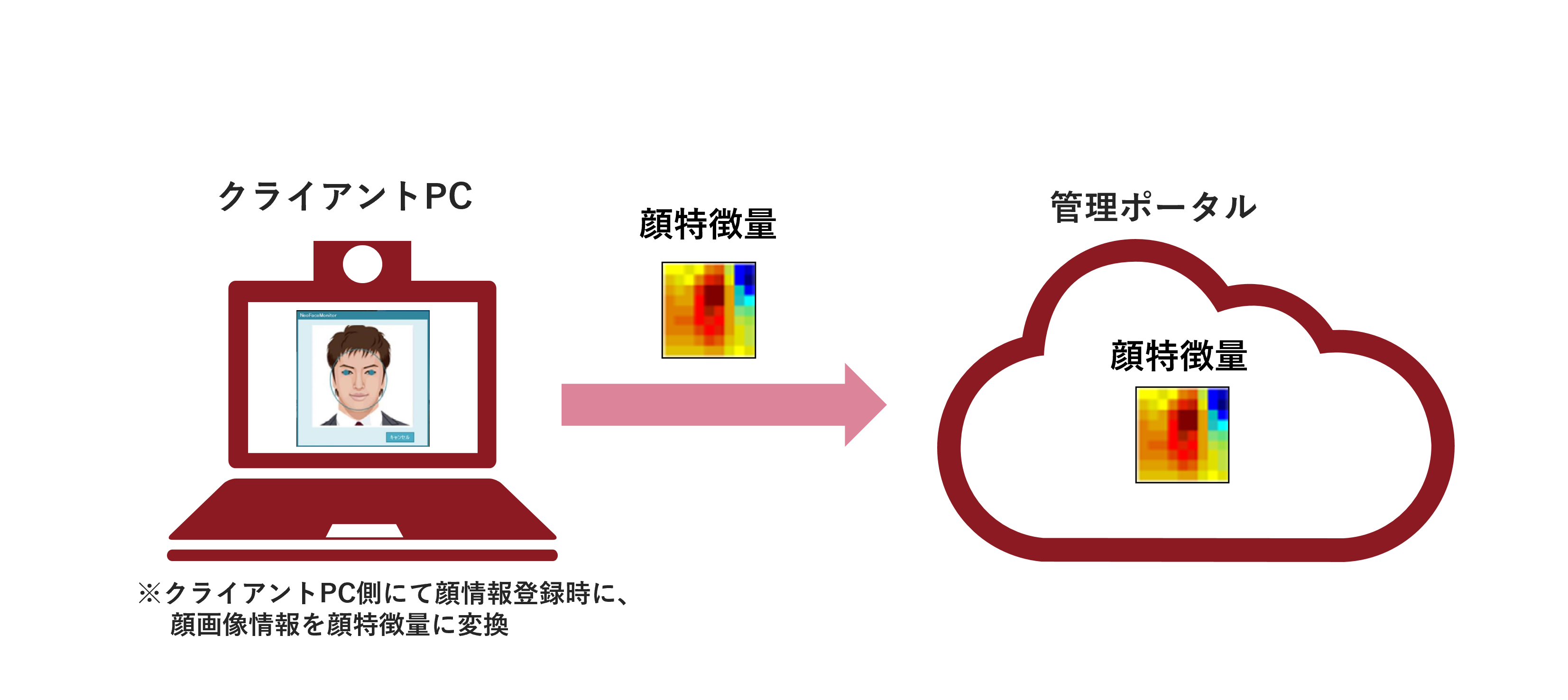 テナント開設時に顔画像を保持しないパターンの運用を選択可能です。管理ポータル上にユーザの顔画像を保持せず運用できます。顔認証時は、顔情報登録時に生成・保存される顔特徴量を利用して認証します。