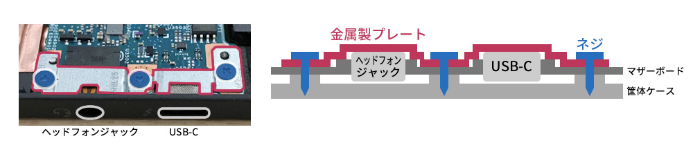 金属製プレートでコネクタ全体を筐体と密接させ、はんだの劣化によるぐらつきと挿抜による接続不良、基盤への接触によるクラックを防ぎます。
