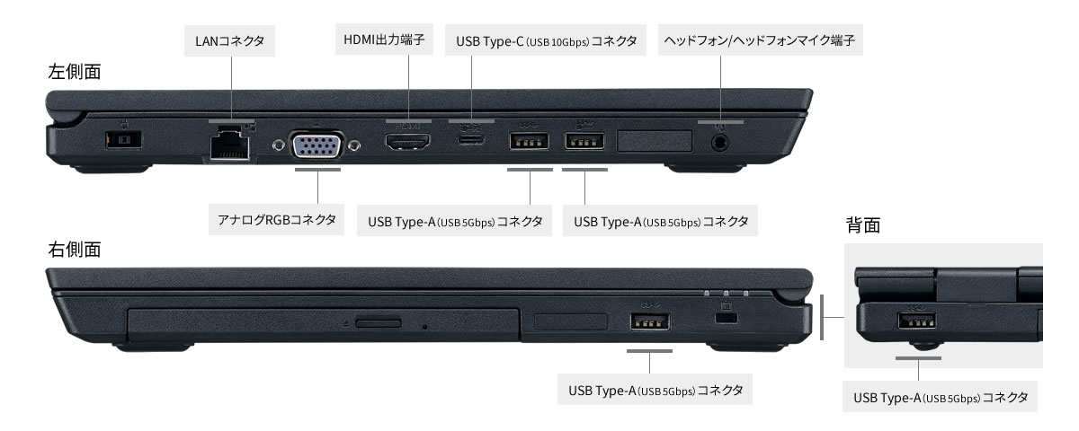 5つのUSBコネクタ(Type-C×1、Type-A×4)や鮮やかな映像出⼒が可能なHDMI出⼒端⼦、SDメモリーカードスロットなどの各種インターフェイスを標準装備しています。