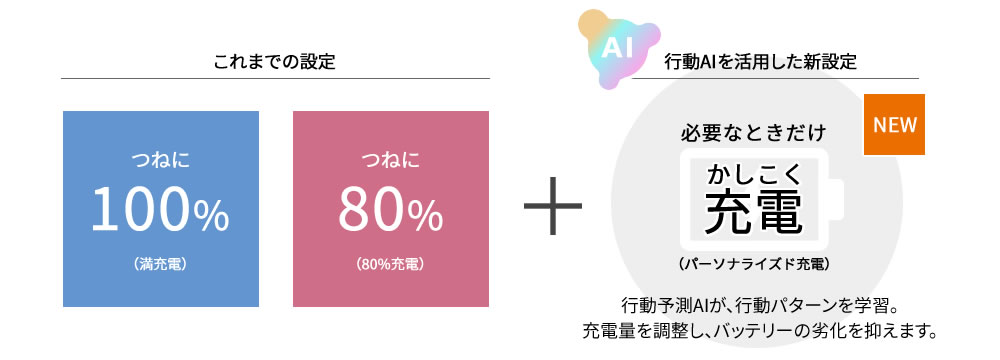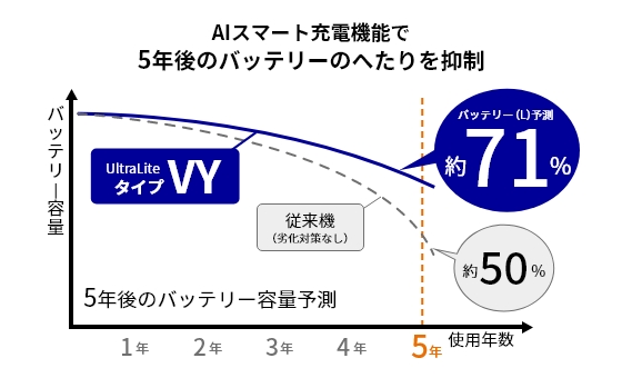 バッテリーが長持ちして数年後も安心して使えるスマート充電機能です。